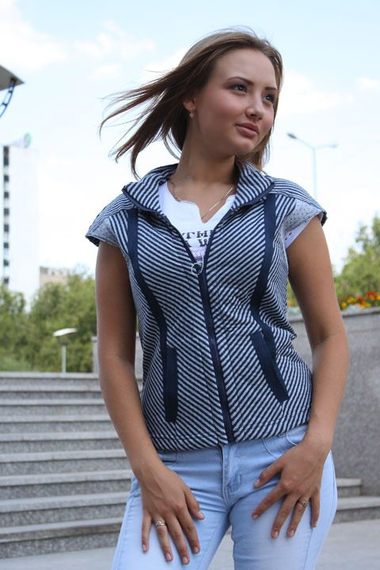 Трикотажный жилет в полоску с контрастной темной отделкой по швам и кармашкам.