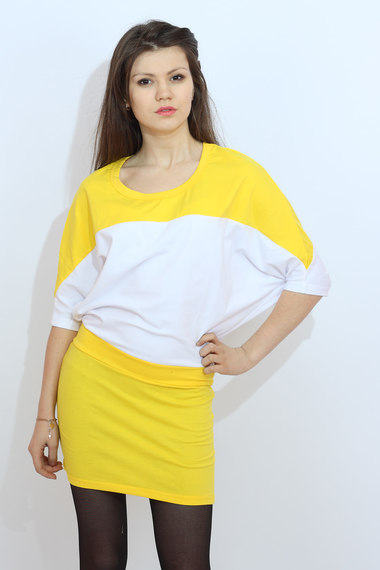 Платье в стиле color-block выполнено из сочетания желтой и белой ткани. Рукава в форме "летучая мышь". Идеально подойдет для вечеринки!