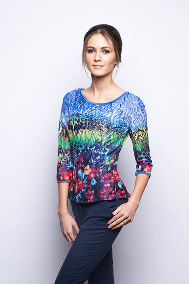Яркая блузка из тонкой сетчатой ткани с цветным принтом. Впереди подкладка в тон блузки, спинка прозрачная, сбоку застежка.