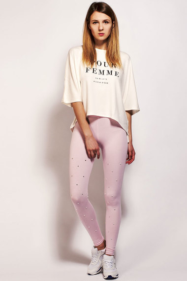 Нежные розовые легинсы из тонкой хлопковой ткани. Впереди украшены крупными стразами.